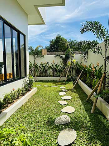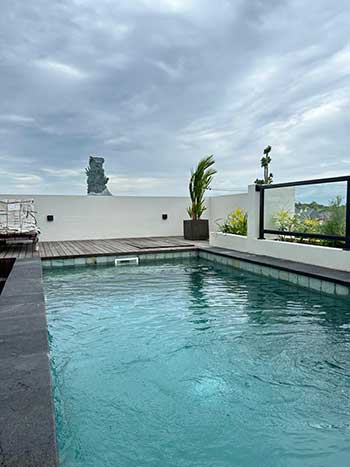 Salah satu daya tarik utama villa ini adalah kolam renang pribadi berukuran 3 x 6 meter yang terletak di lantai dua. Dari area ini, Anda dapat menikmati pemandangan ikonik Garuda Wisnu Kencana (GWK), memberikan pengalaman relaksasi yang unik dan eksklusif. Selain itu, terdapat area taman yang asri, menambah nuansa sejuk dan natural di dalam hunian.