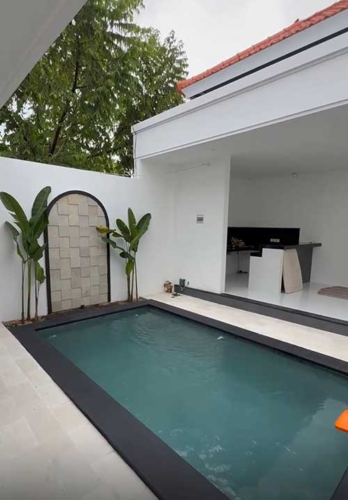 The open-plan living and kitchen area creates a bright, airy atmosphere that seamlessly connects to the outdoor pool area—perfect for entertaining guests or enjoying relaxed tropical living. The private pool becomes the centerpiece of the home, offering a refreshing escape in Bali’s warm climate.